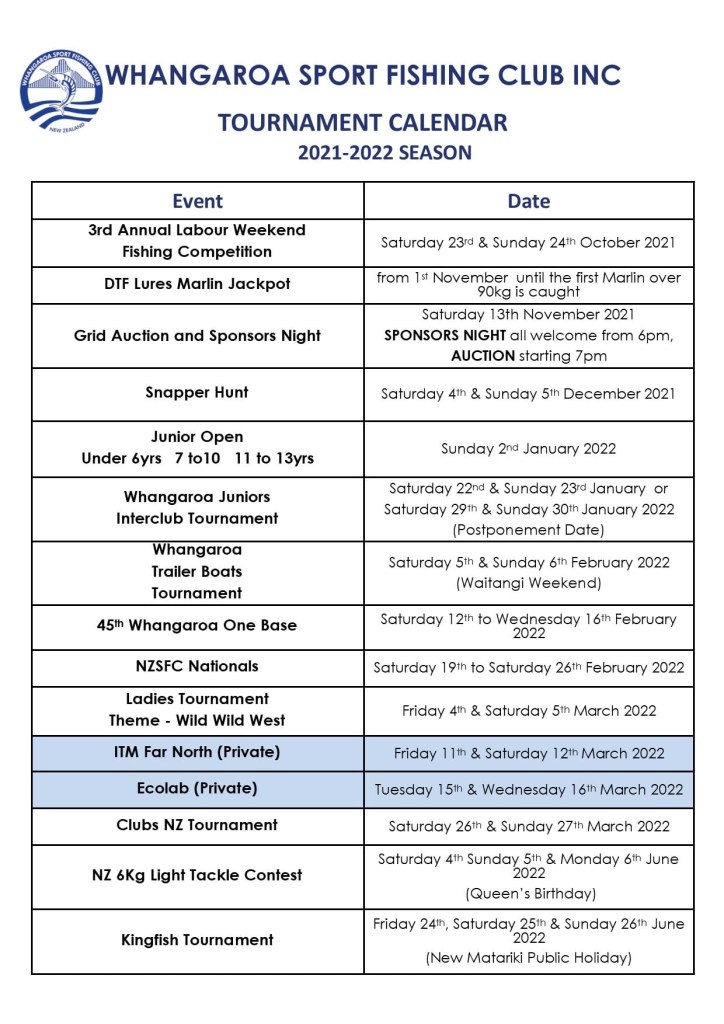 The schedule for fishing activities released by the local fishing club is attached. Make sure you are booked for the period.
